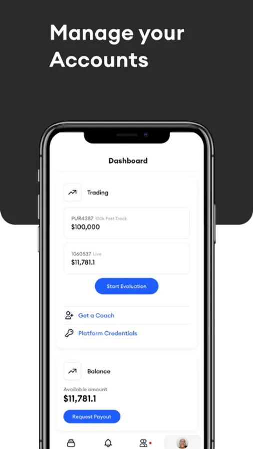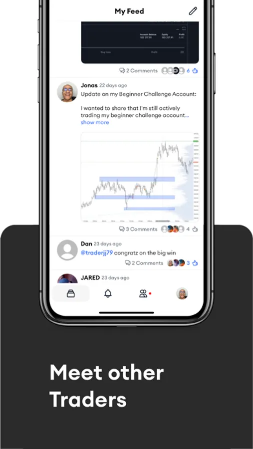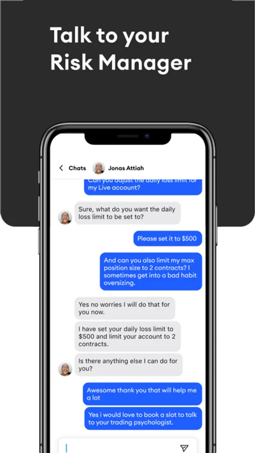 Elevate your trading experience with our powerful trading management app. Designed exclusively for retail traders, our app provides a comprehensive suite of services and tools accessible through the chat, facilitated by our expert coaches and risk managers. With their guidance, you'll have access to personalized advice and coaching tailored to your trading needs. Our vibrant community of traders will further enhance your experience, allowing you to connect with like-minded individuals who share your passion for the markets.