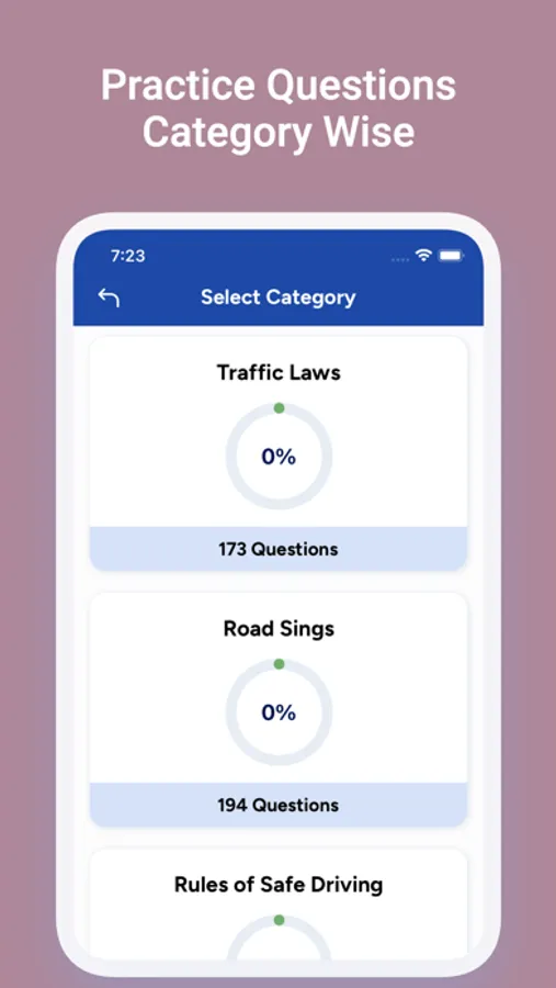 The app includes a practice module that allows to get familiar with questions that fall under different categories like Traffic Rules, Road Signs and Rules of Safe driving. It also keeps track of the progress you have made in each category. It contains questions from following categories:
