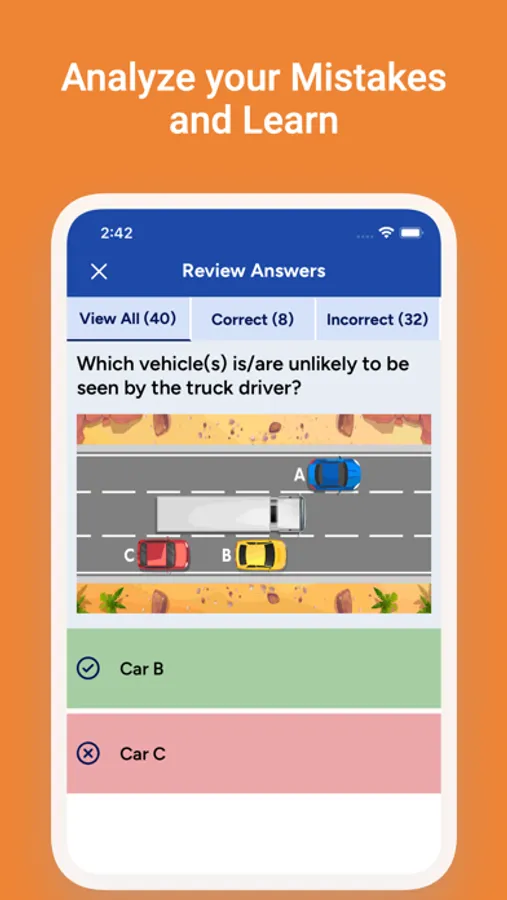 You will get the test result based on the official criteria to pass the Driver’s License Test. You will also be able to find out what questions you've done wrong after taking the test.