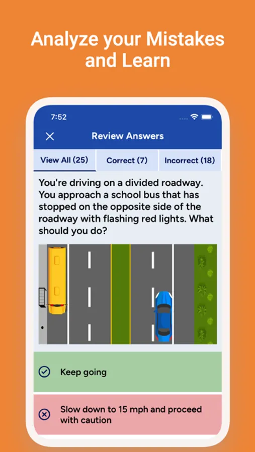 You will get the test result based on the official criteria to pass the Driver’s License Test. You will also be able to find out what questions you've done wrong after taking the test.