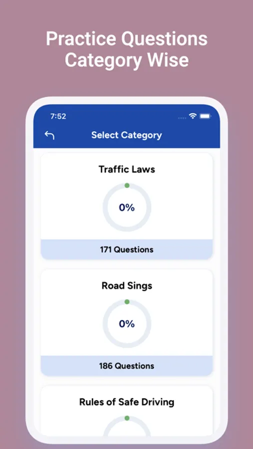 The app includes a practice module that allows to get familiar with questions that fall under different categories like Traffic Rules, Road Signs and Rules of Safe driving. It also keeps track of the progress you have made in each category. It contains questions from following categories: