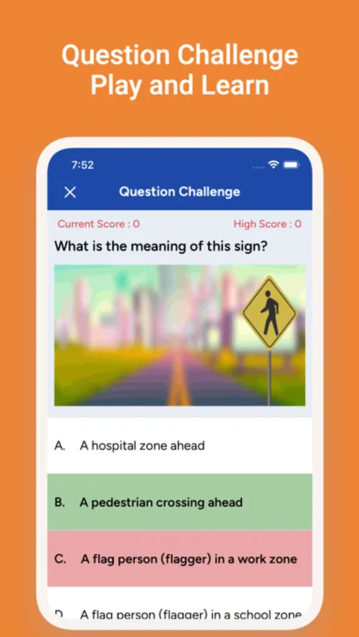 This is a unique feature of our application. It allows you learn while playing a challenge game. Your score will go up by one point each time you correctly answer a question up until the point where you get it wrong. It keeps record of your high score.