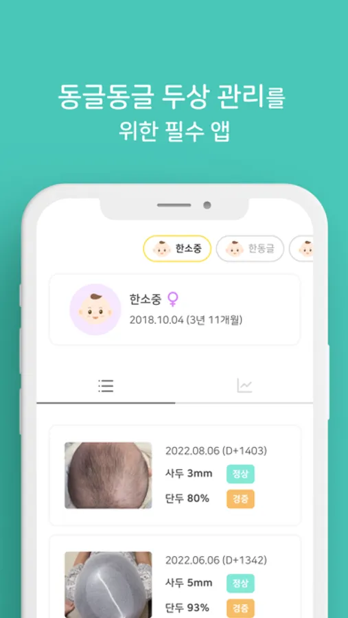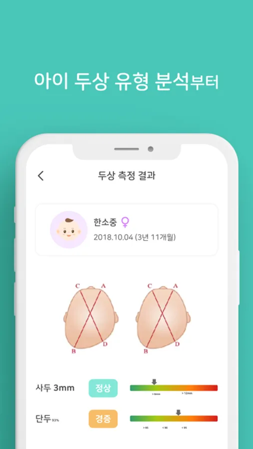 동글베베 어플은 간단한 사진 촬영을 통해 두상을 평가하고, 그에 대한 관리 방법을 알려드립니다. 또한 이전 결과들과 비교하여 올바르게 두상이 자라고 있는지 지속적으로 확인할 수 있습니다.