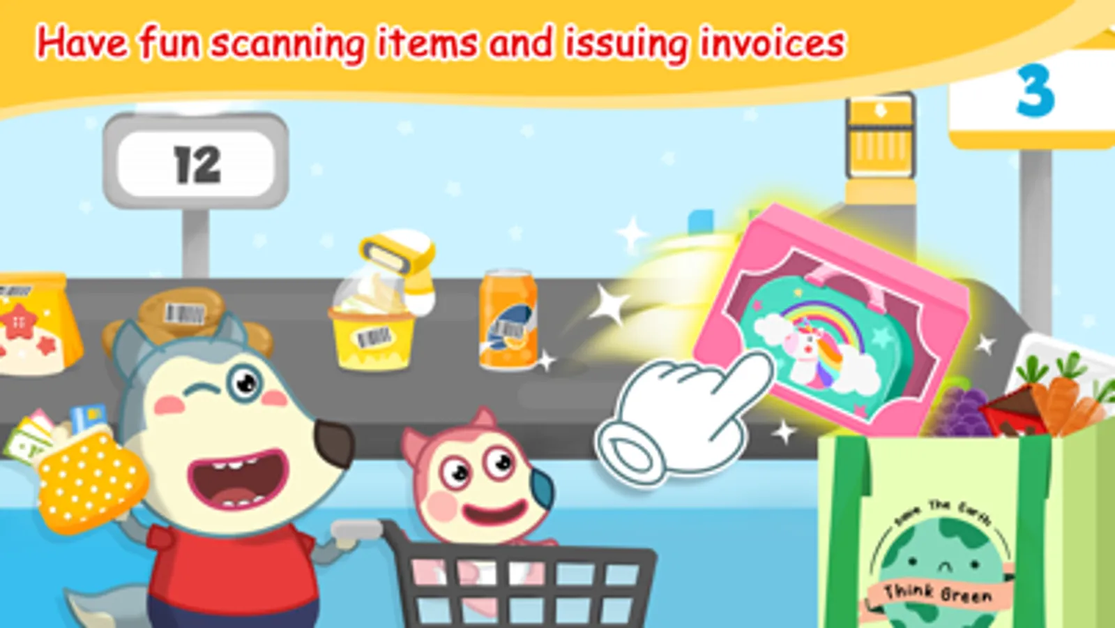 Come to Wolfoo Supermarket, Shopping to enjoy shopping and participate in exciting games in the shopping mall. You will be responsible for helping Wolfoo shop for items on the shopping list, print labels for cashiers, and fishing. The supermarket sells a variety of products that are familiar for you: fruits, vegetables, fishs, drinks, etc. You will be happy to search for products and fill the trolley. Through this game, player will learn the knowledge of color, shape recognition and math, recognizing the food around.
