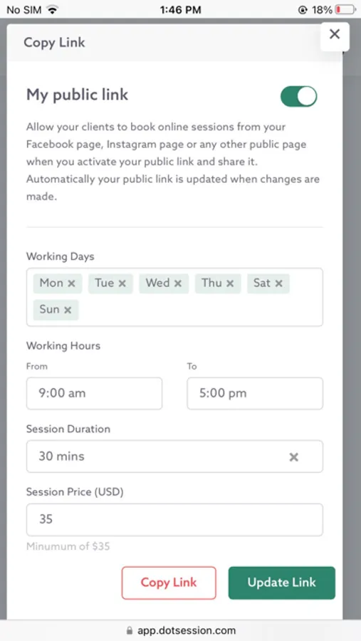 Post their public link to allow their clients to book online sessions with them from their public pages (Facebook, Instagram, ..etc), then simply join sessions from calendar