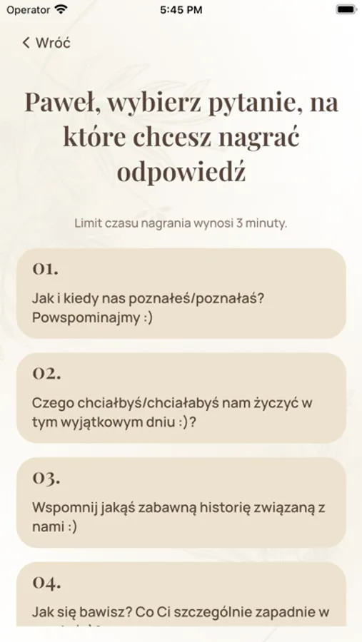 VideoStory to nowy sposób na utrwalenie wspomnień z wyjątkowego dnia za pomocą formatu krótkich nagrań czyli stories - to osobista kolekcja tematycznych wspomnień nagranych przez Twoich gości. Wystarczy że zdefiniujesz tematykę na która mogą odpowiedzieć goście jak ulubione wspólne wspomnienie, czy moment poznania - a goście będą mogli nagrać swoją odpowiedź lub umieścić powstałe już wspólne nagranie, które lubią wspominać. VideoStory to nowy sposób na dzielenie pięknych chwil z bliskimi.