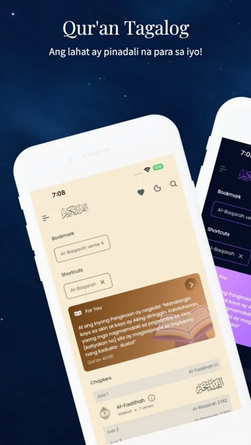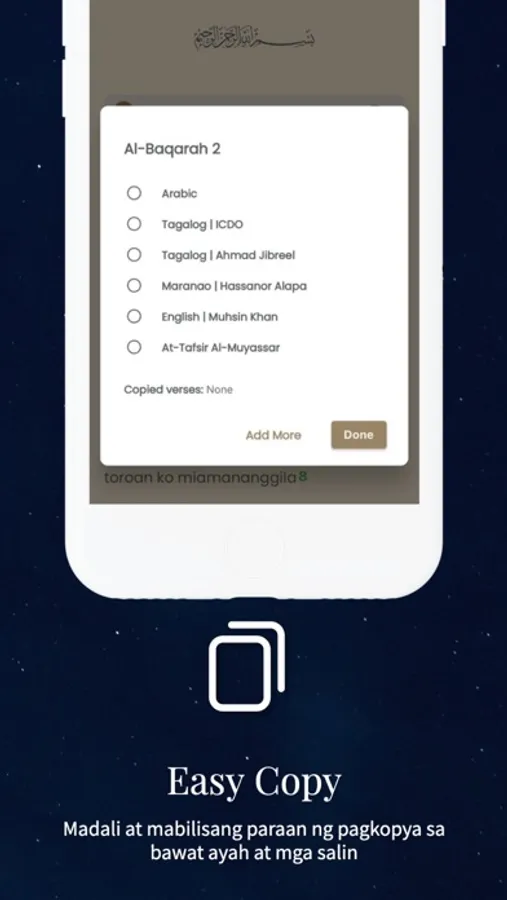 Get ready to enhance your Qur'an study with Quran Tagalog-English! Our app is designed to provide the best user experience while you recite and memorize the Qur'an. With translations available in Tagalog, Maranao and English, this app is perfect for anyone looking to deepen their understanding of the Qur'an. Plus, our app includes a search feature to help you easily find specific verses.
