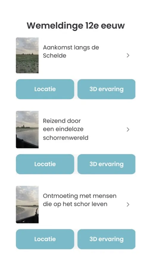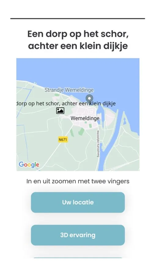 Doormiddel van 360 graden virtual Reality panorama beelden kan de gebruiker met of zonder VR bril rondkijken in het Wemeldinge (Zeeland) van de 12 eeuw. In jaar 1150 zag Wemeldinge er heel anders uit en moesten de inwoners anders omgaan met hun omgeving om te overleven. Deze app werkt het meest optimaal wanneer uw de ingebouwde routeplanner ter plaatste gebruikt, en zo nog duidelijker het verschil kan zien tussen de middeleeuwen in het jaar 1150 en vandaag.