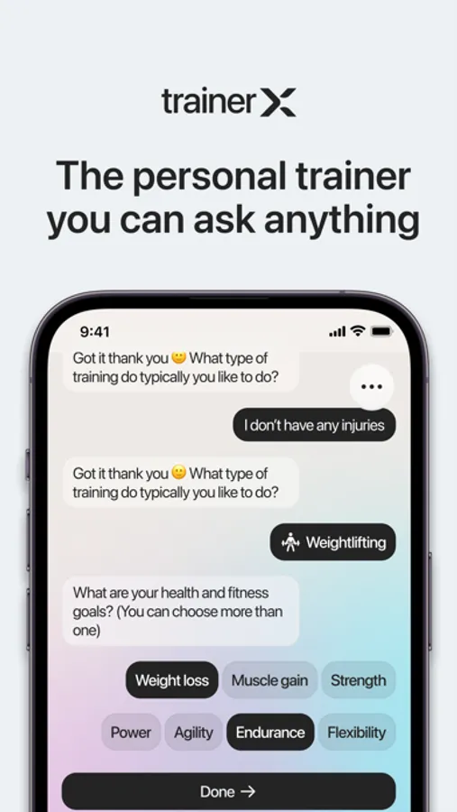 Welcome to trainerX, your ultimate personal training companion that’s designed to keep you motivated and on track to achieving your health and fitness goals. Our app is more than just a personal trainer - it’s your own AI-powered support system that’s always there for you, no matter where you are.