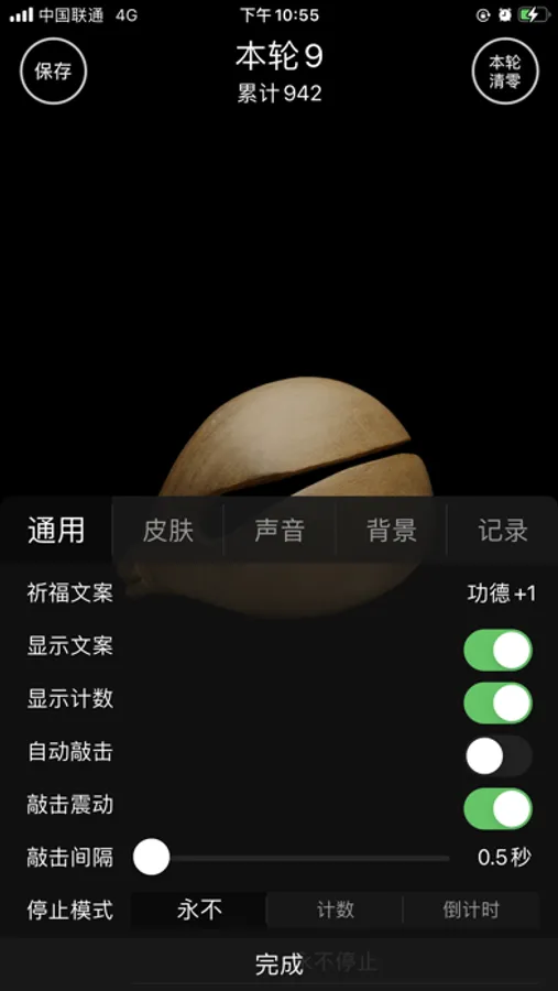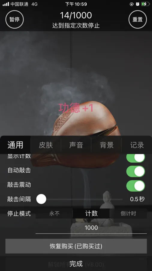 2 皮肤搭配:10多种木鱼样式,且支持透明度调整,大小调整和位置调整,打造属于您心目中的木鱼。