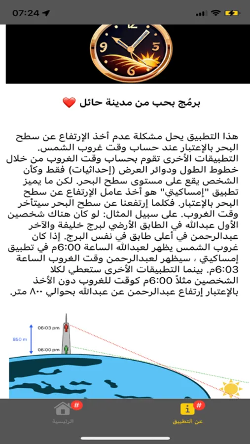 هذا التطبيق يحل مشكلة عدم أخذ الإرتفاع عن سطح البحر بالإعتبار عند حساب وقت غروب الشمس. التطبيقات الأخرى تقوم بحساب وقت الغروب من خلال خطوط الطول ودوائر العرض (إحداثيات) فقط وكأن الشخص يقع على مستوى سطح البحر. لكن ما يميز تطبيق "إمساكيتي" هو أخذ عامل الإرتفاع عن سطح البحر بالإعتبار. فكلما إرتفعنا عن سطح البحر سيتأخر وقت الغروب. على سبيل المثال: لو كان هناك شخصين الأول عبدالله في الطابق الأرضي لبرج خليفة والآخر عبدالرحمن في أعلى طابق في نفس البرج. إذا كان غروب الشمس يظهر لعبدالله الساعة 6:00م في تطبيق إمساكيتي ، سيظهر لعبدالرحمن وقت الغروب الساعة 6:03م. بينما التطبيقات الأخرى ستعطي لكلا الشخصين مثلاً 6:00م كوقت للغروب دون الأخذ بالإعتبار إرتفاع عبدالرحمن عن عبدالله بحوالي ٨٠٠ متر.
