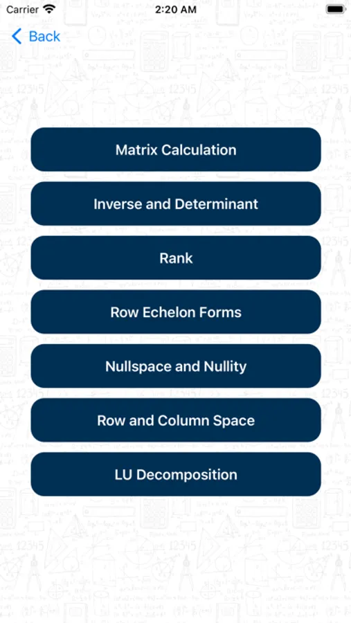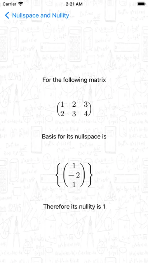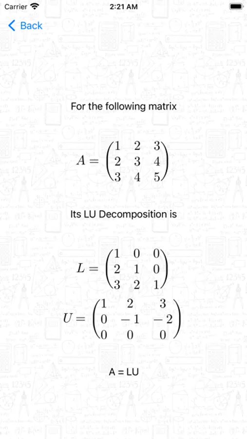 The app supports solving a system of linear equations, and solving multiple matrix related questions. Through the app, you are able to perform basic matrix calculations, find inverse and determinant, find rank, find row echelon forms, find nullspace and nullity, find basis of row and column space, and perform LU decomposition.