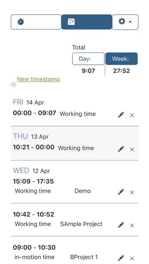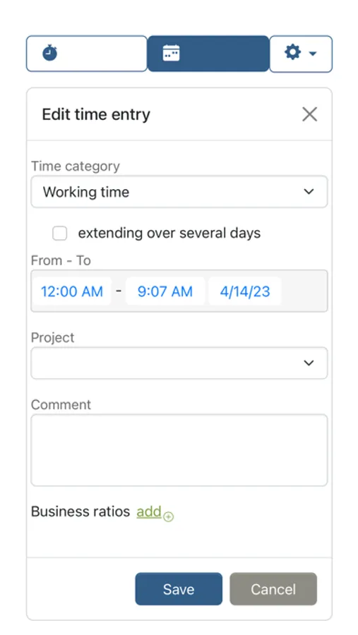 Current time entries can be created and changed. Time categories, projects, comments and business values are supported.