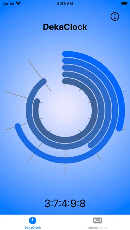 Da die Länge einer Sekunde eine sehr gut einzuschätzende Zeit ist und auch die kürzeste Zeitdauer im traditionellen Zeitschema darstellt, muss DekaClock etwas ungefähr Vergleichbares anbieten. Ein Tag hat die Dauer von 24 * 60 * 60 = 86.400 Sekunden. Dafür hat ein DekaClock Tag 100.000 deka-5 Einheiten, da die Zahl ja eine ganzzahlige Potenz der Zahl 10 sein muss. Dadurch bekommt das DekaClock Zeitschema 5 Zeitränge für die Angabe der akkuraten Zeit jeden Tages: deka-1, deka-2, deka-3, deka-4 und deka-5. Eine deka-5 Zeiteinheit ist damit etwas kürzer als eine Sekunde, konkret 0,864 Sekunden. Aber dies ist nahe genug an einer Sekunde, dass sich das Fortschreiten der Uhrzeit ähnlich wie bei einer traditionellen Uhr "anfühlt", wie die DekaClock App zeigt.