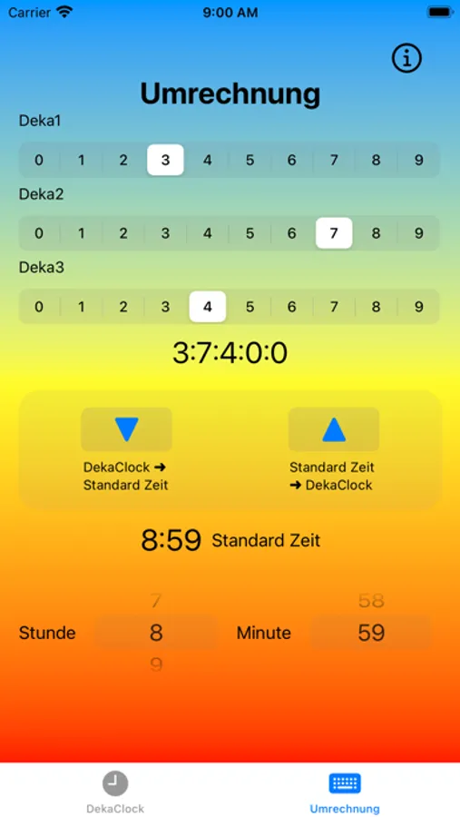 Eine deka-1 Zeiteinheit ist dadurch ein Zehntel eines vollen Tages von 24 Stunden und damit 2 Stunde 24 Minuten. Die Uhrzeit "9 deka-1" entspricht damit zum Beispiel 21:36h auf unserer gewöhnlichen Uhr. Eine gute Zeit zu Bett zu gehen.