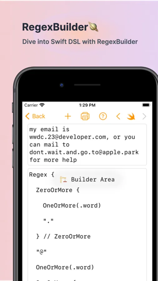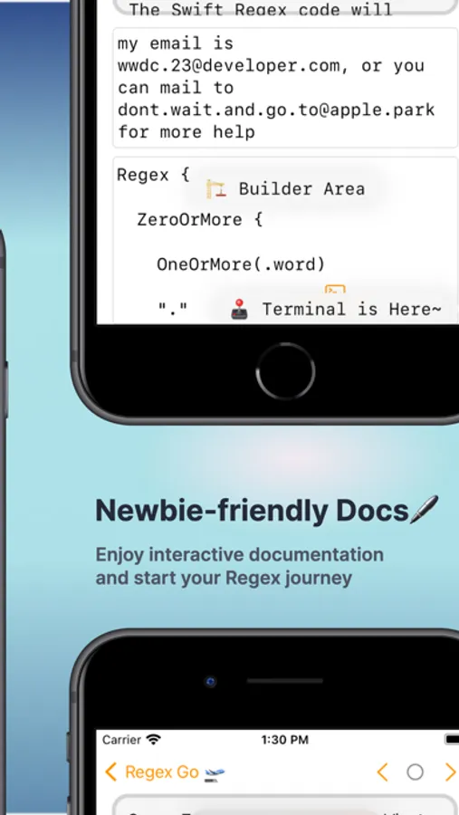 At WWDC22, RegexBuilder was introduced as a DSL (domain-specific language) to construct regex in a more readable and maintainable manner. Regex Go's aim is to make it easier for individuals who are unfamiliar with Regex to use it. Users can easily drag and drop to promptly construct their own regex without having to learn the intricate syntax and rules. This will allow more individuals to appreciate the joy of coding and increase their work efficiency.