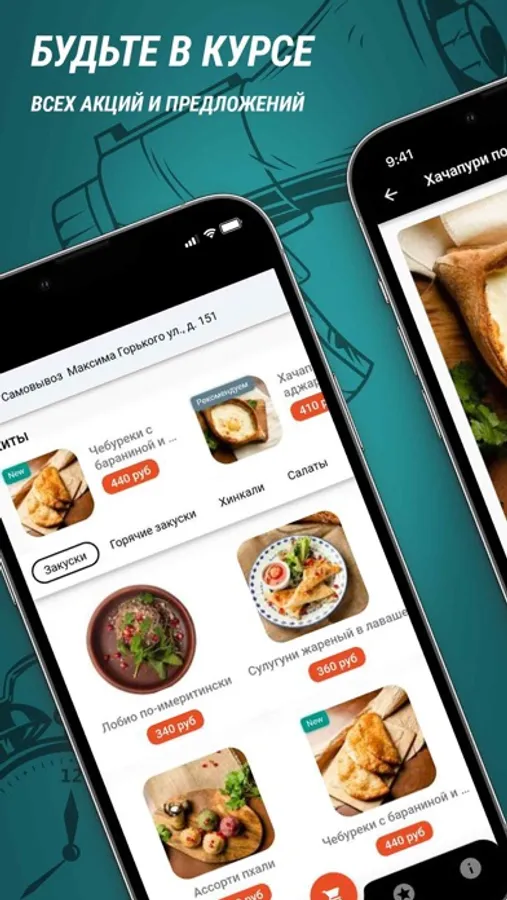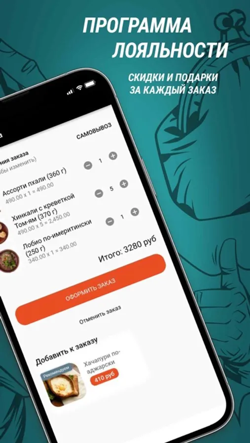 В нашем мобильном приложении «КИНЗА» вы можете заказать доставку грузинских блюд на дом и в офис или оформить заказ на самовывоз.