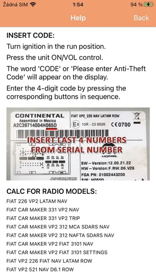 Calc CODE for radios FIAT TORO VULCANO FREEDOM - JEEP RENEGADE - model CONTINENTAL VP1 or VP2 - Made in Mexico.