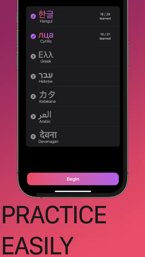 - Learn 7 different alphabets (Hangul, Cyrillic, Greek, Hebrew, Katakana, Arabic, and Devanagari), with more coming soon!