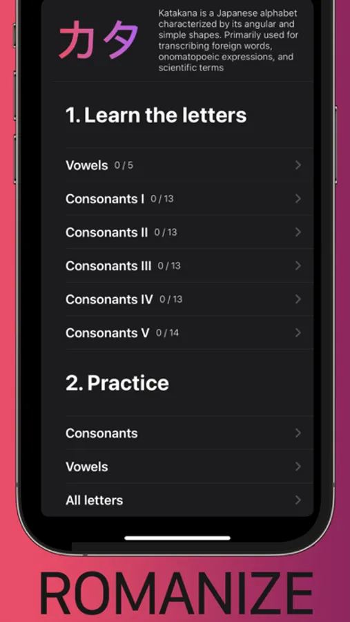 - Romanize learns from you, and prioritizes letters you need more practice with