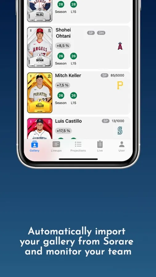 Forget manual updates and tedious data management. SorareFP seamlessly integrates with your Sorare gallery, effortlessly pulling your card information and automatically updating your gallery within the app. Say goodbye to time-consuming processes and focus on what matters most: enjoying the exhilarating world of Sorare MLB.