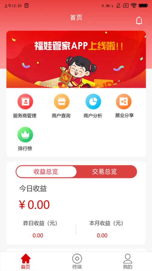 福娃管家 app是一款创新型收款AP,主要满足服务商随对随地进行对商户进行管理,为服务商提供商户查询交易信息、管终饰pos机、今日收益、今日交易、服务商管理、商户管理、商户分析、结算信息、常见问题、终端管理、终端调拔、终端回拔、批量设置费率、批量设置活动、批量设sim卡、终端统计、终端总数、账户余额等服务。