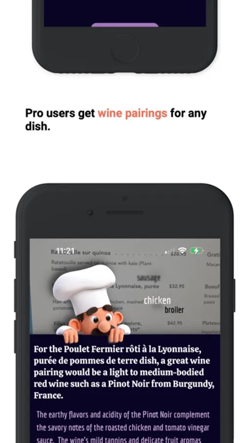 Master any restaurant menu. Whether you're a foodie who loves fine dining, or a cautious eater trying to avoid certain ingredients, Menu Mate will change the way you eat. Just point your phone at a menu, tap the dish you're curious about, and within seconds an astonishing AI Chef can give you an expert read on what you might expect- no typing! It's MUCH faster than searching the internet trying to figure out more about an item on the menu, only to get buried in ads and loosely related recipes.