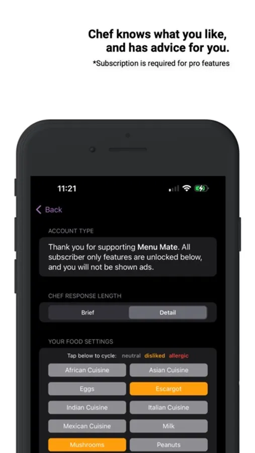 Allergies: You can flag many common allergies in the app settings with a couple button taps. Chef will give you preliminary info on what might be typical for a dish considering your allergies. Be sure to ask your server for more information, as Chef isn't working in that kitchen, and can only give you general information. If you have severe allergies, you'll need to talk to the local chef next to be certain.