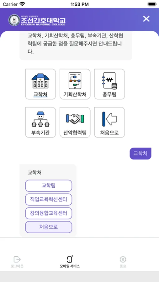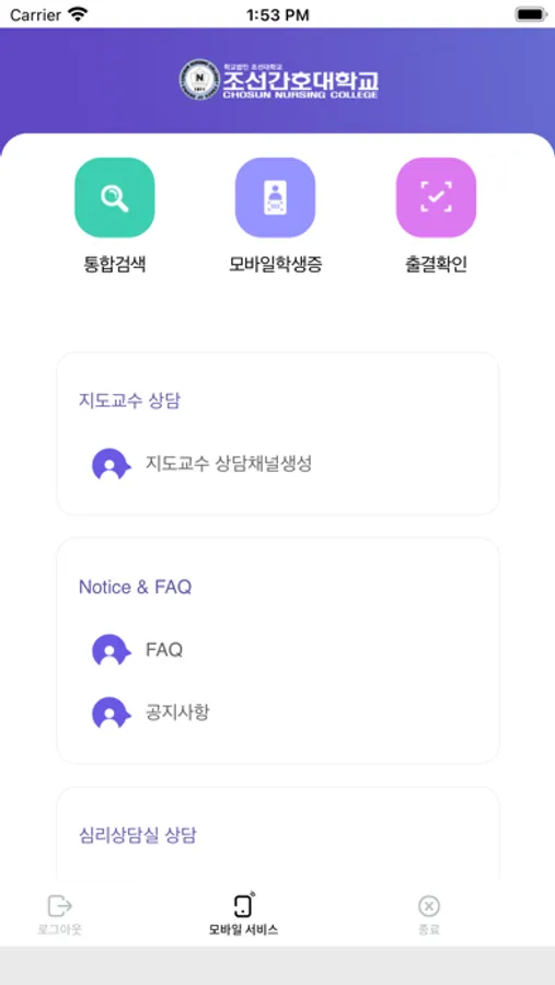 조선간호대학교 모바일앱은 지도 교수 상담, 공지사항, 심리 상담, FAQ, 학사 모바일 웹뷰 페이지를 제공합니다.