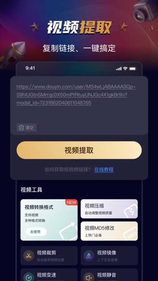 视频工具箱APP是制片帮旗下一款简单便捷的视频编辑工具,提供视频提取、视频转换格式、视频压缩、视频裁剪、视频镜像、视频加水印、视频拼接、视频MD5值修改等服务。