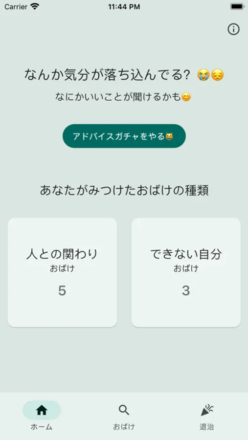 このアプリは、落ち込んだときにAIからアドバイスをもらえたり、日常の思考のおばけを紹介するアプリです。