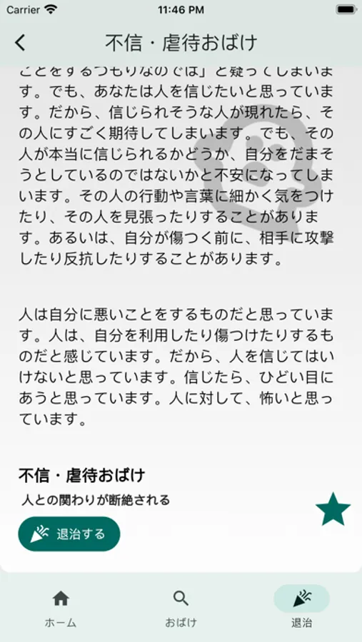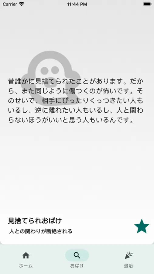 思考のおばけは、心理的に苦しい思いの原因になっているかもしれない考えのたとえです。もしあなたに心当たりがあるおばけがいたら星マークをタップします。