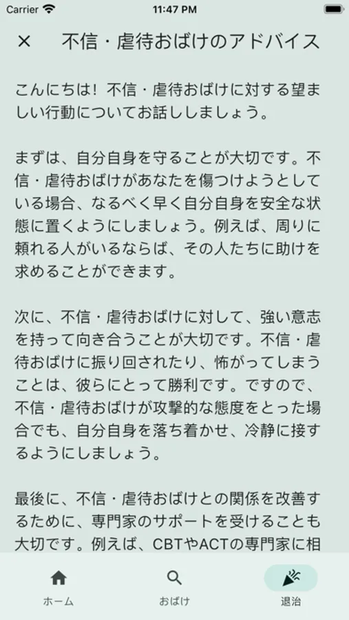 退治のボタンをタップすると、おばけに対してAIがおばけ対策のアドバイスをつくり、アドバイスが表示されます。