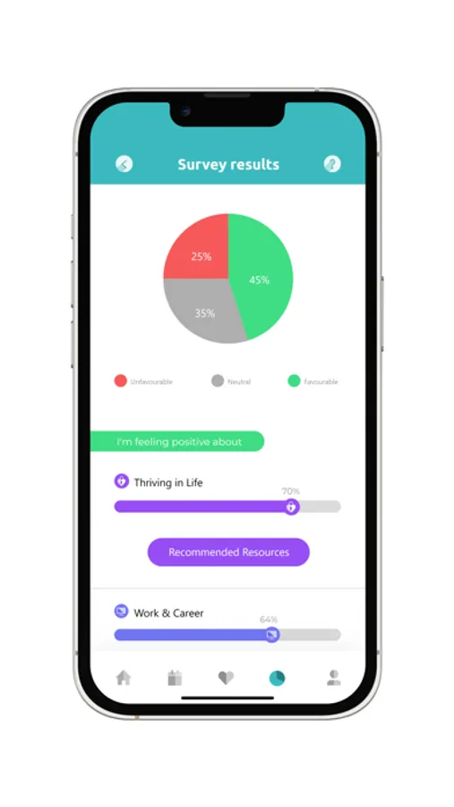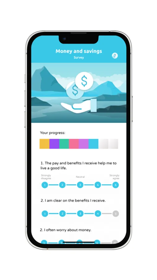 It offers an integrative solution, using the principle of holistic wellbeing to create meaningful individual journeys. The app is structured around eight areas of wellbeing, namely Purpose and Meaning, Thriving in life, Connection and Belonging, Health and Fitness, Knowledge and Creativity, Work and Career, Money and Savings, and Work Environment.