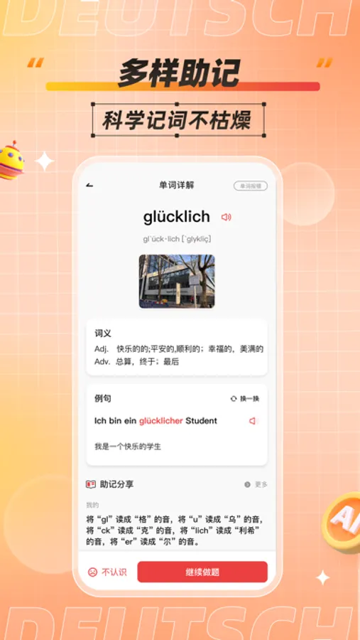 德语单词助手是一套专门针对德语学习者特别设计的背单词软件,搭配每日一练,助你在了解单词真实语境的同时,科学高效的背单词。