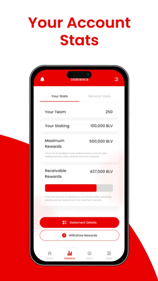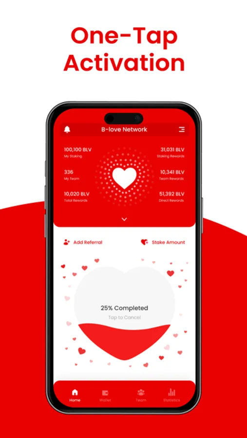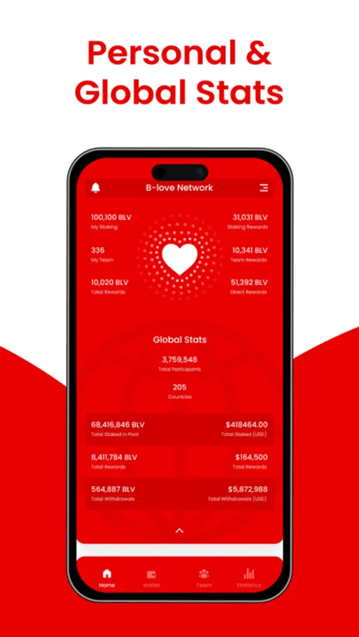 Explore the global and personal stats of B-Love Network. Browse through your teams, staking & reward stats on your personal stats screen or learn about the global staking & earning stats of the network app.