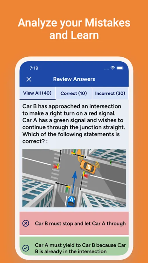 You will get the test result based on the official criteria to pass the Driver’s License Test. You will also be able to find out what questions you've done wrong after taking the test.