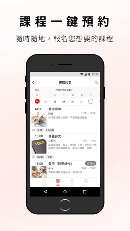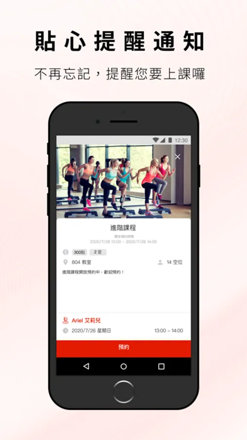 註冊會員之後,你將能隨時隨地的掌握教室的課表,所有老師以及課程介紹,並隨時隨地的預約或取消自己想要上的課程,甚至還能連動行事曆,自動提醒你預約的課程時間!