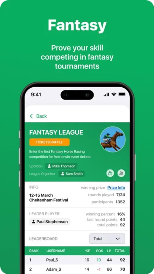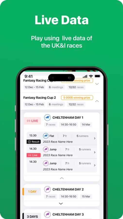 LIVE DATA - Experience the perfect blend of virtual and real-world horse racing with Fantasy Horse Racing's Live Data feature. Select horses from actual races, make virtual selections, and witness their live results in real-time. Immerse yourself in the thrill of the track as you engage with the excitement and unpredictability of real-world horse racing events.