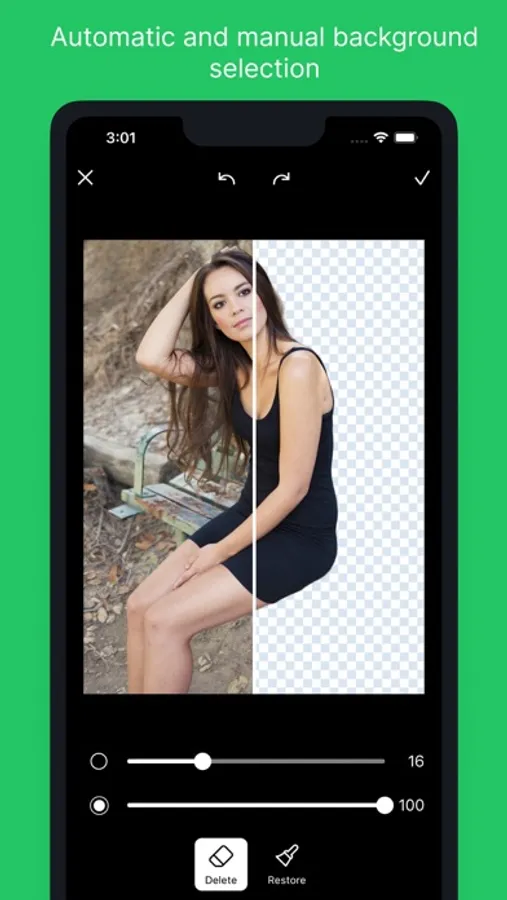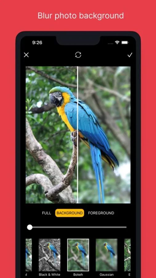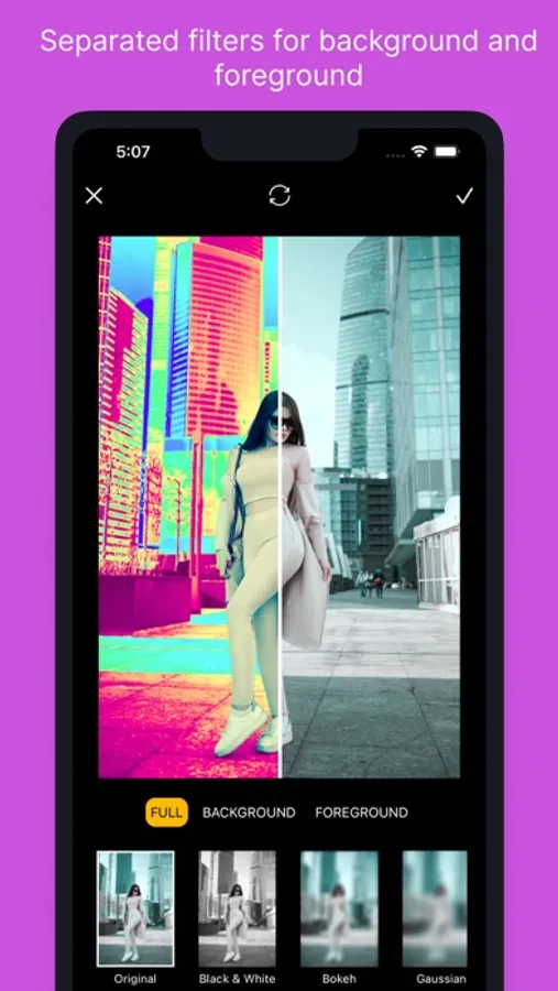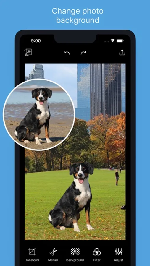 AI-powered photo background eraser and editor for automatic photo background removal and editing. Easily change (superimpose) photo background by selecting a photo from your library or using integrated royalty-free image search. Apply various filters and adjustments to full photo or separately to photo background and foreground.