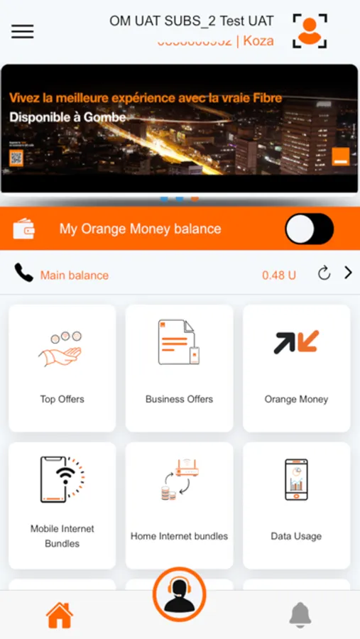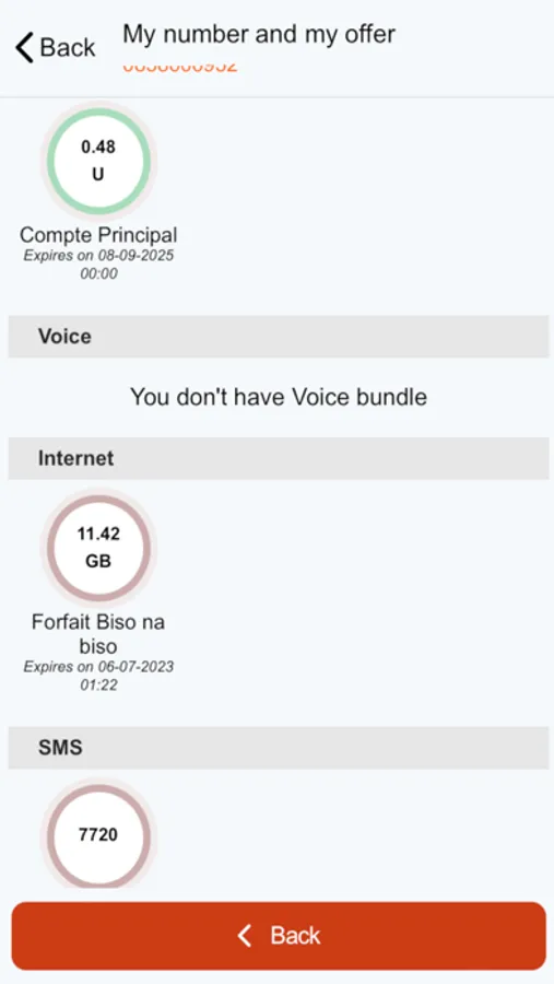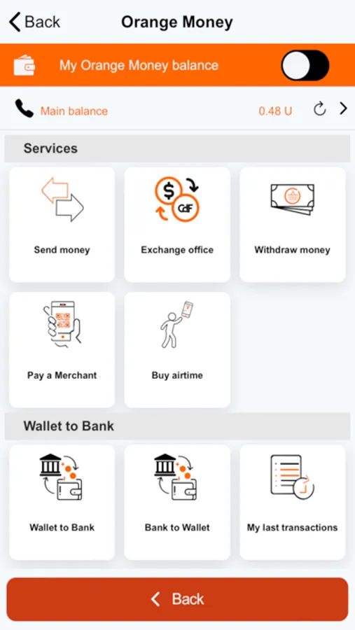 - Consult your mobile account (Units, Minutes, SMS, Internet) and your Orange Money account (Balance) in real time, in the same application