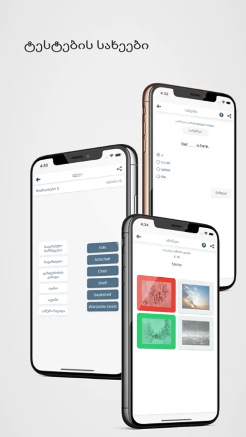 Test your knowledge of the different types of tests offered by the app, such as: connecting words that have the same meaning, finding the correct answer in the picture, translating the word or sentence, listening to the sentence and then writing it, pronouncing the sentence that appears, and more.