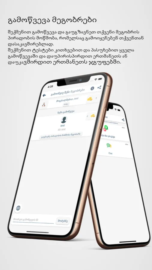 Create a challenge and send the ID to your friend who will find you and contact you. As part of the challenges, create tests with questions and answers and challenge each other or communicate in groups.