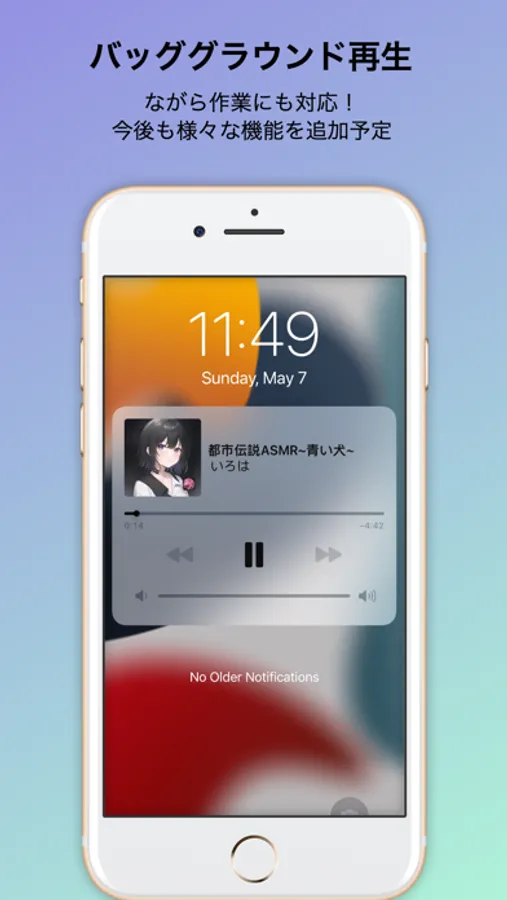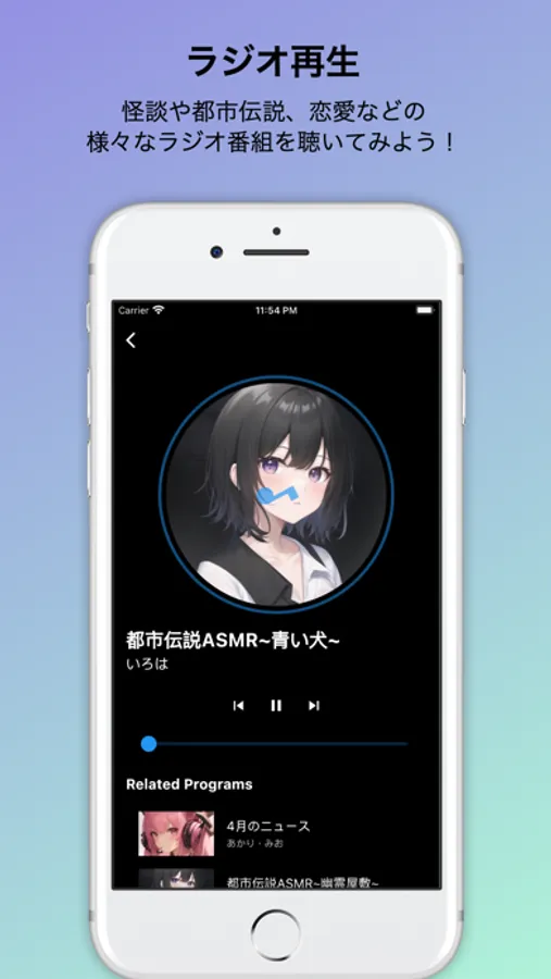 バーチャルキャラクターが出演する独自のラジオ番組を楽しむことができます。バックグラウンド再生にも対応しており、他のアプリを使用しながらラジオを楽しむことができます。