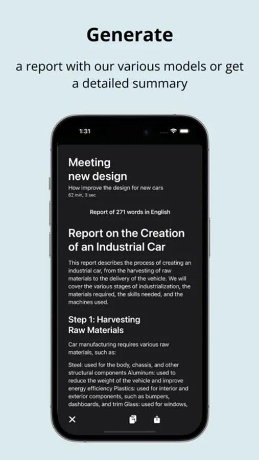 Whether it's business meetings, lectures, creative brainstorming, our app captures every word, every idea, and transforms them into detailed reports, accurate transcripts, and concise summaries.