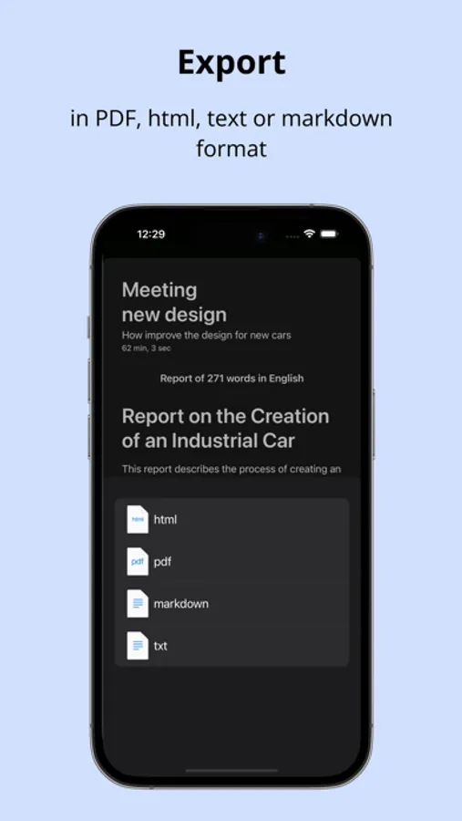 Our app allows for the translation of your recorded discussions into numerous languages, broadening your communication horizons. Once your discussions are processed, you can export your reports, transcripts, summaries, and translations in PDF, HTML, text, or markdown formats, as per your needs.