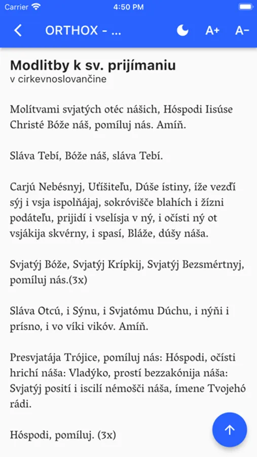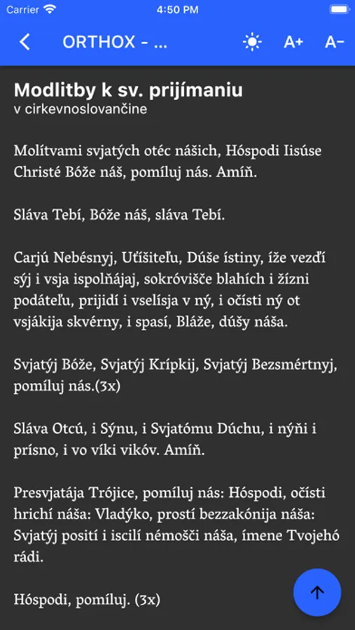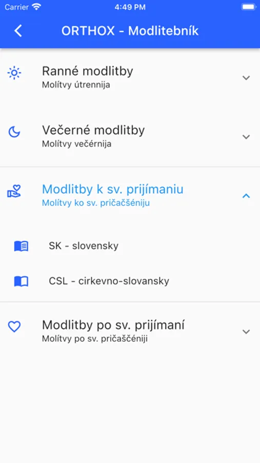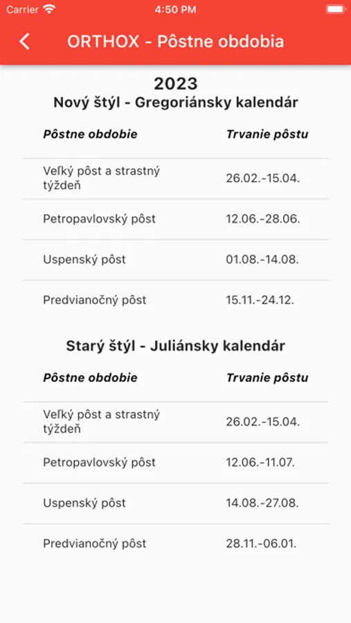 Je možné si zobraziť pôstne obdobia v roku, dátum Paschy na najbližšie roky, ale aj modlitebník s rannými, večernými modlitbami a modlitbami pred a po svätej tajne prijímania.