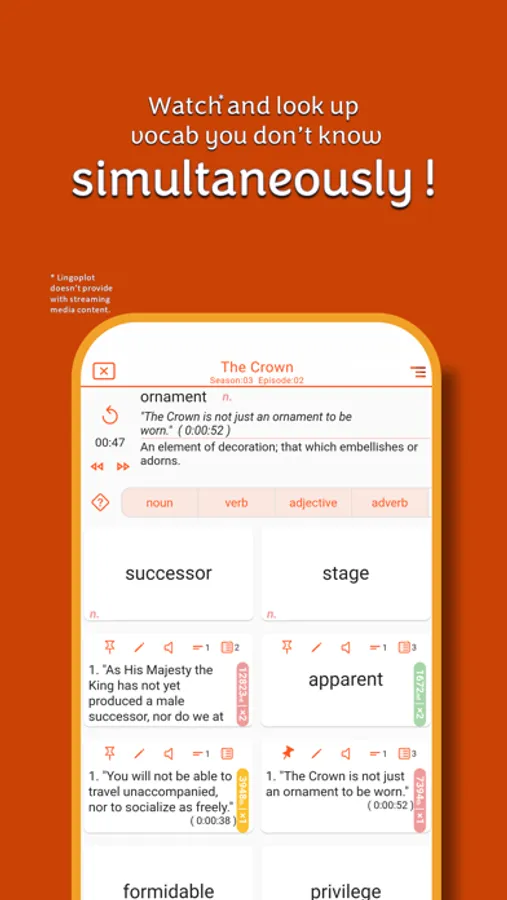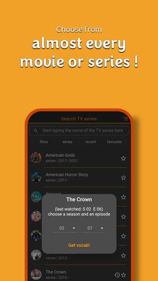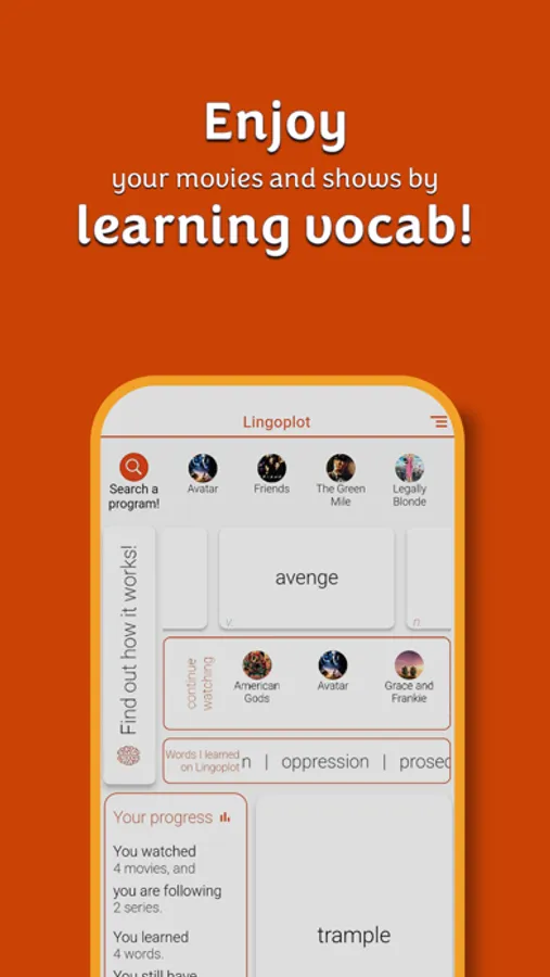 Use Lingoplot to practice vocabulary for hundreds of thousands of shows and movies! Simply select your language level, the show or movie you want to watch and allow Lingoplot to pull together the vocab for you to practice before you sit back and relax!