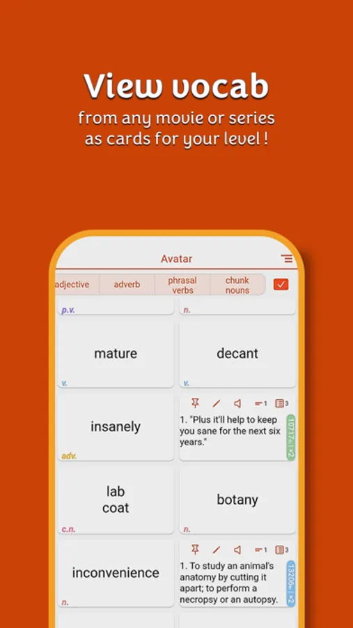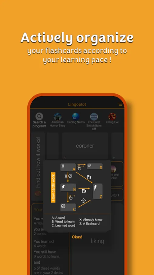 Lingoplot generates the vocab for your chosen show and movie according to your level, and presents it to you in the form or cards. You can then create your own deck of flashcards, view definitions and even context.
