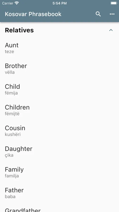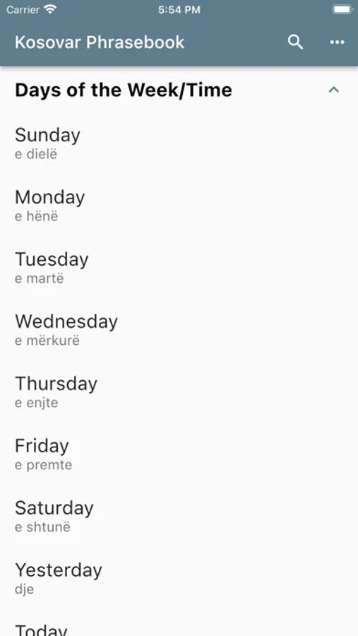 Using this app, you can select an English phrase and view its translation and how to pronounce it in Kosovar.